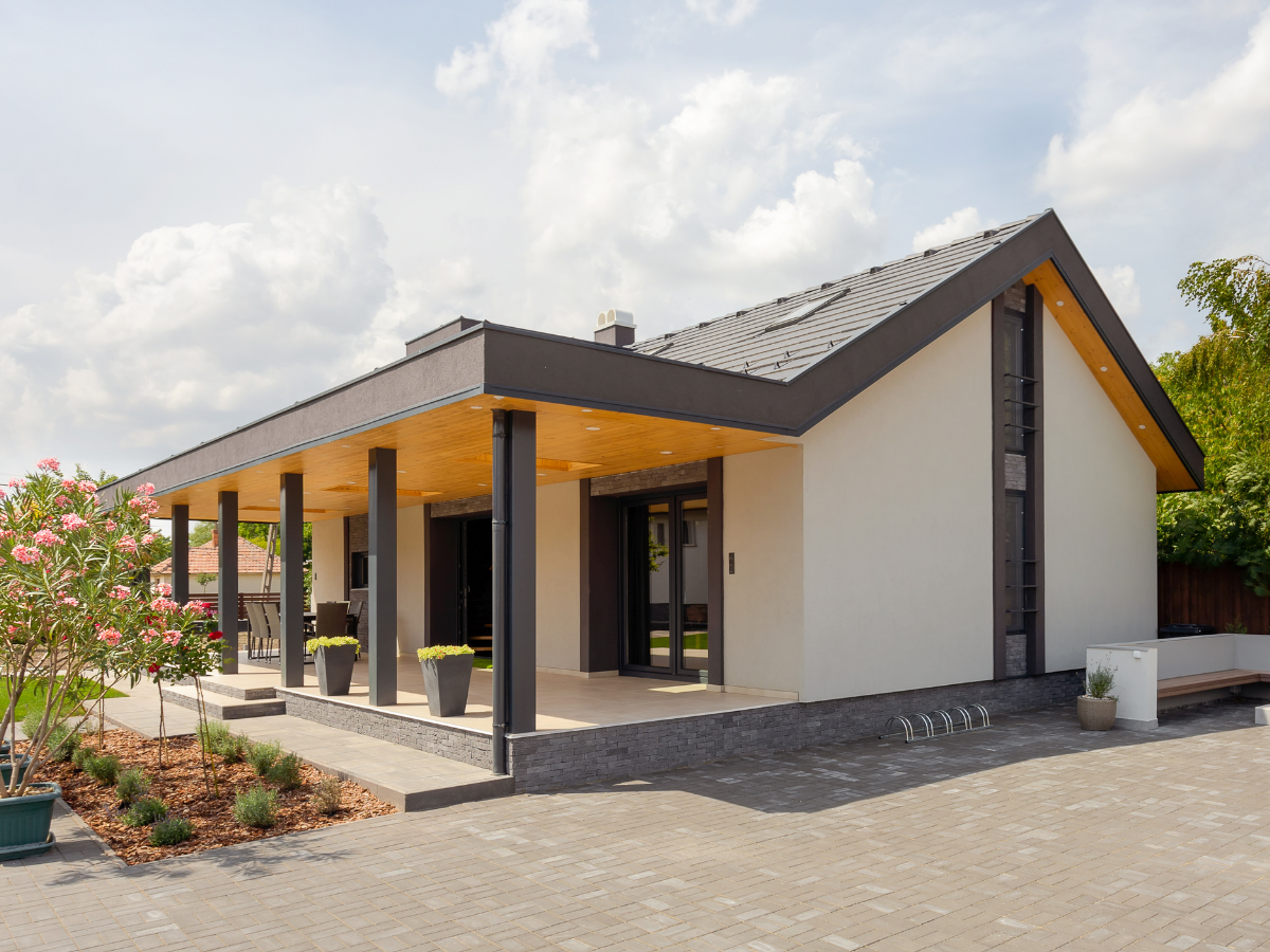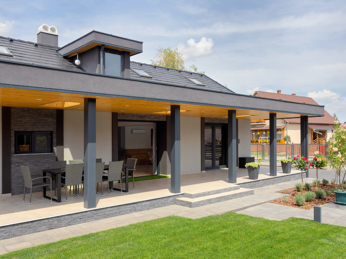 A kültéri közösségi tér egy tágas terasz, kerti asztallal és székekkel, ahonnan közvetlenül megközelíthető a ház melletti tűzrakóhely – tökéletes helyszín baráti összejövetelekhez és hangulatos esti programokhoz.