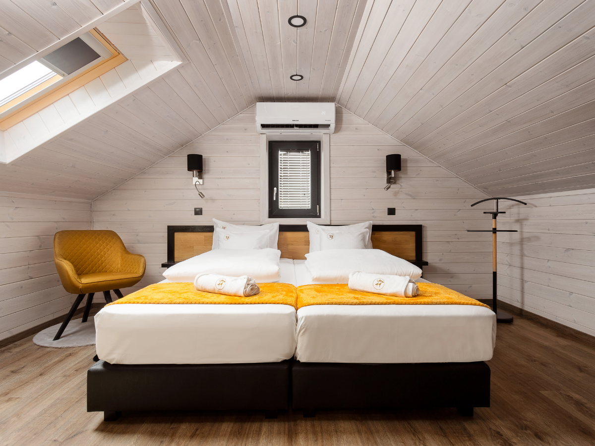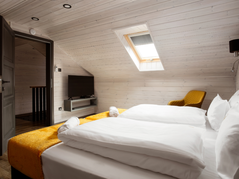 - 1 db franciaágyas szoba: UHD Smart televízió (IPTV, magyar és idegen nyelvű programokkal), frissen húzott ágynemű, személyenként 1 db fürdőlepedő bekészítés, 1 db ruhásszekrény akasztóval, vállfákkal, kóddal zárható rögzített széffel, bőröndtartó, szobainas
