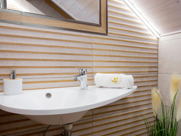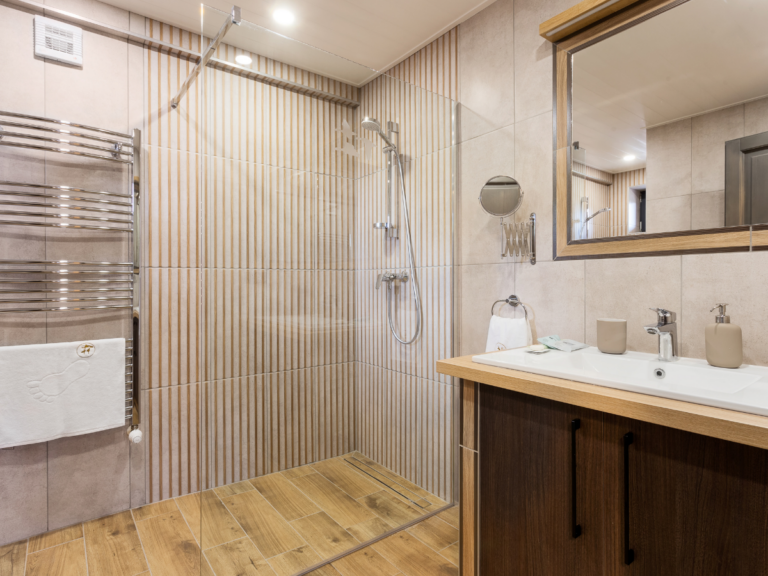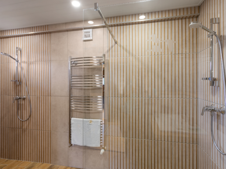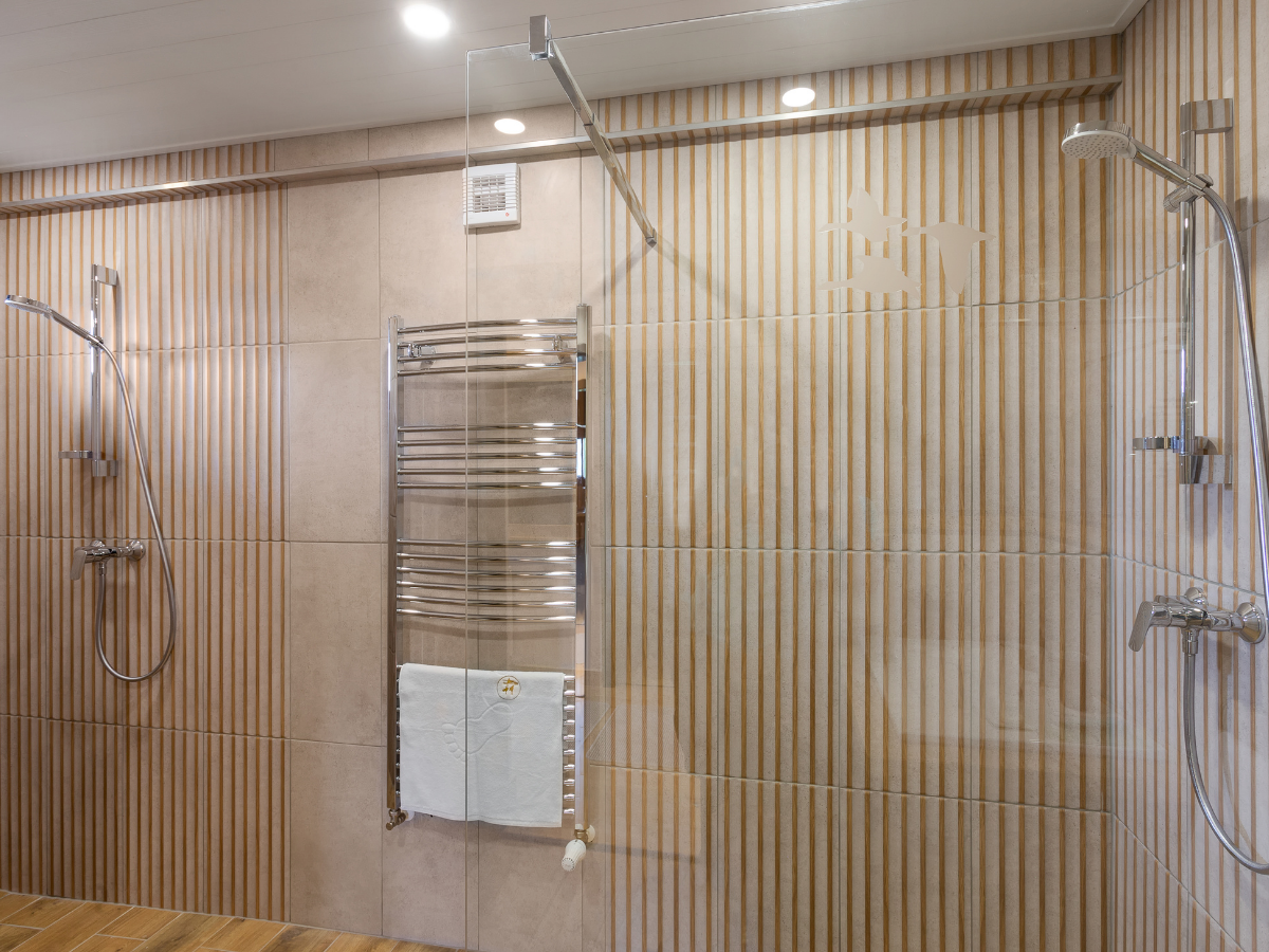 Fürdőszoba: 2 db épített zuhanykabin, hajszárító, kéztörlő és kádkilépő bekészítés, folyékony kézmosó szappan, fogkefetartó, smink/borotválkozó tükör