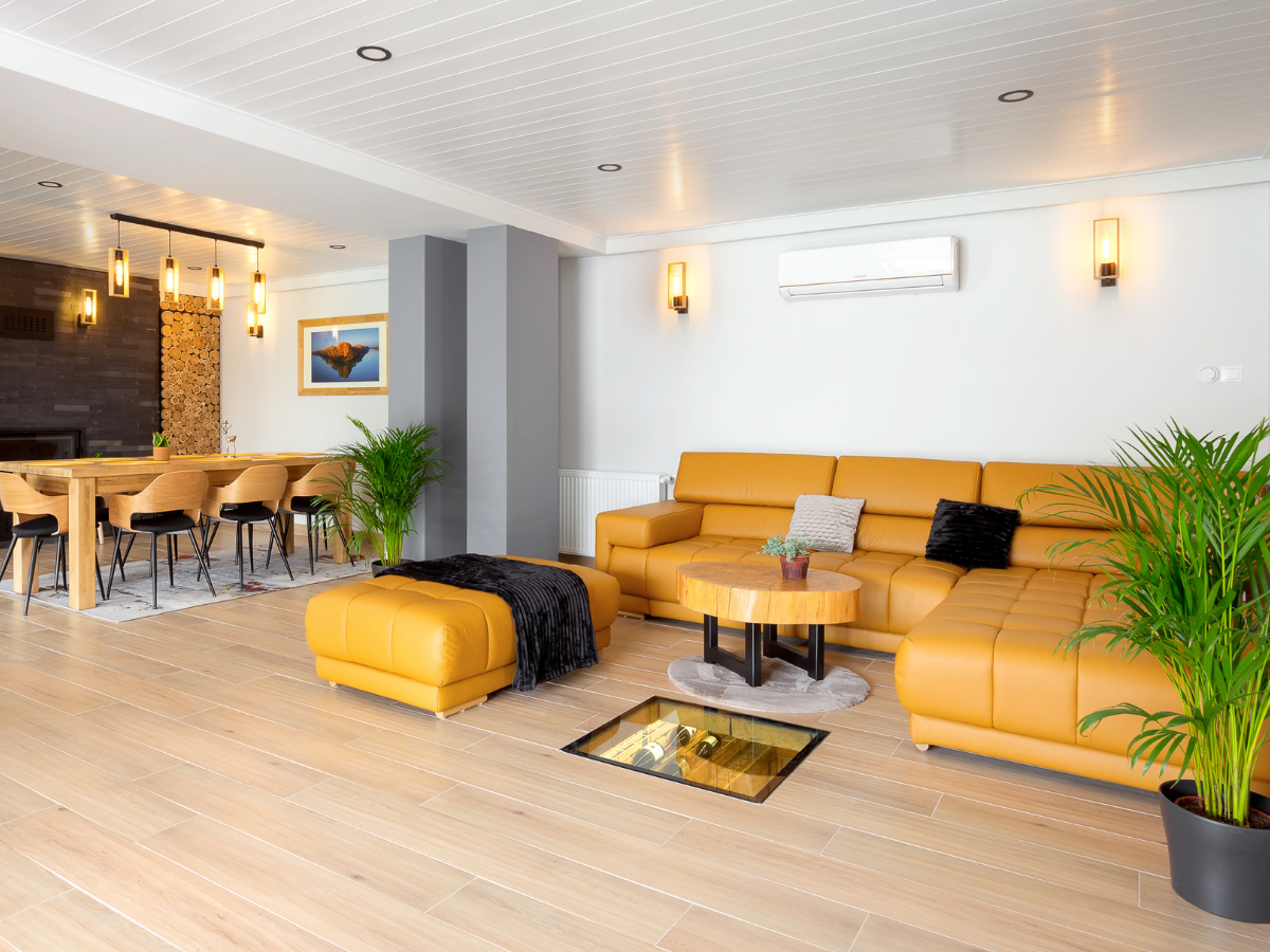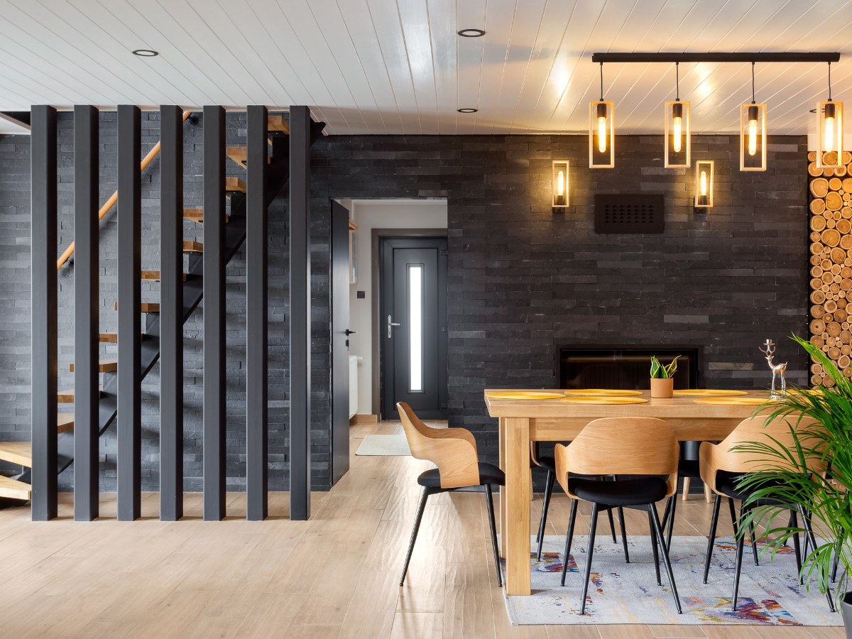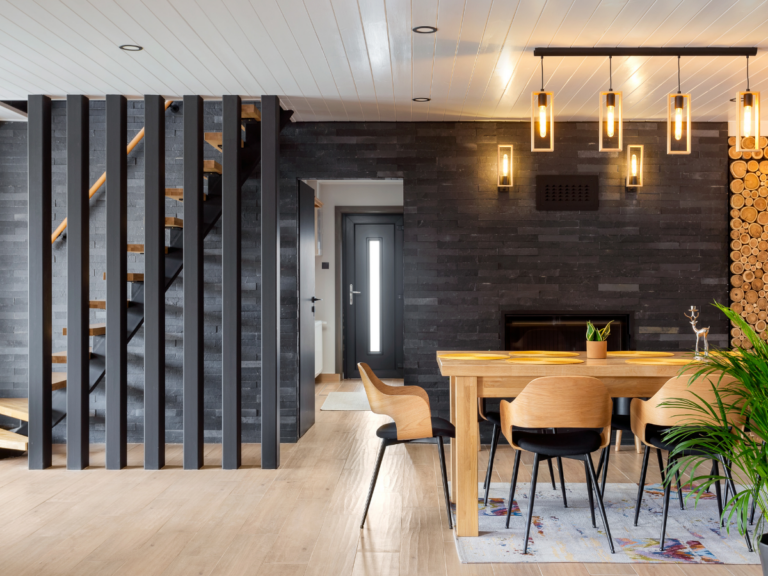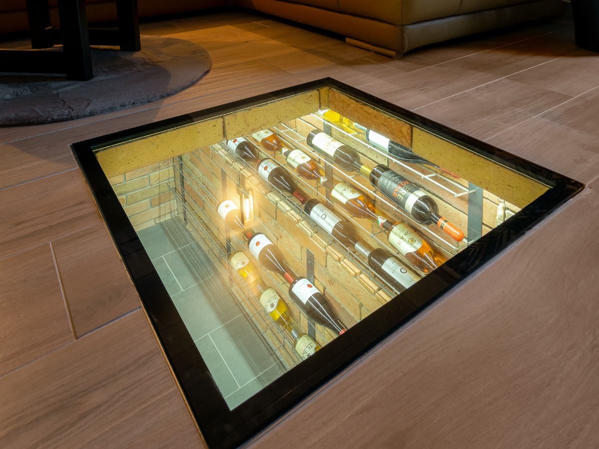 A földszinten egy tágas, kandallós nappali és étkező várja a vendégeket, kényelmes bőr sarokkanapéval. A tér különlegessége a régi autószerelő aknából kialakított, járható edzett üvegfelület alá rejtett bortrezor, amely igazán egyedi hangulatot teremt.