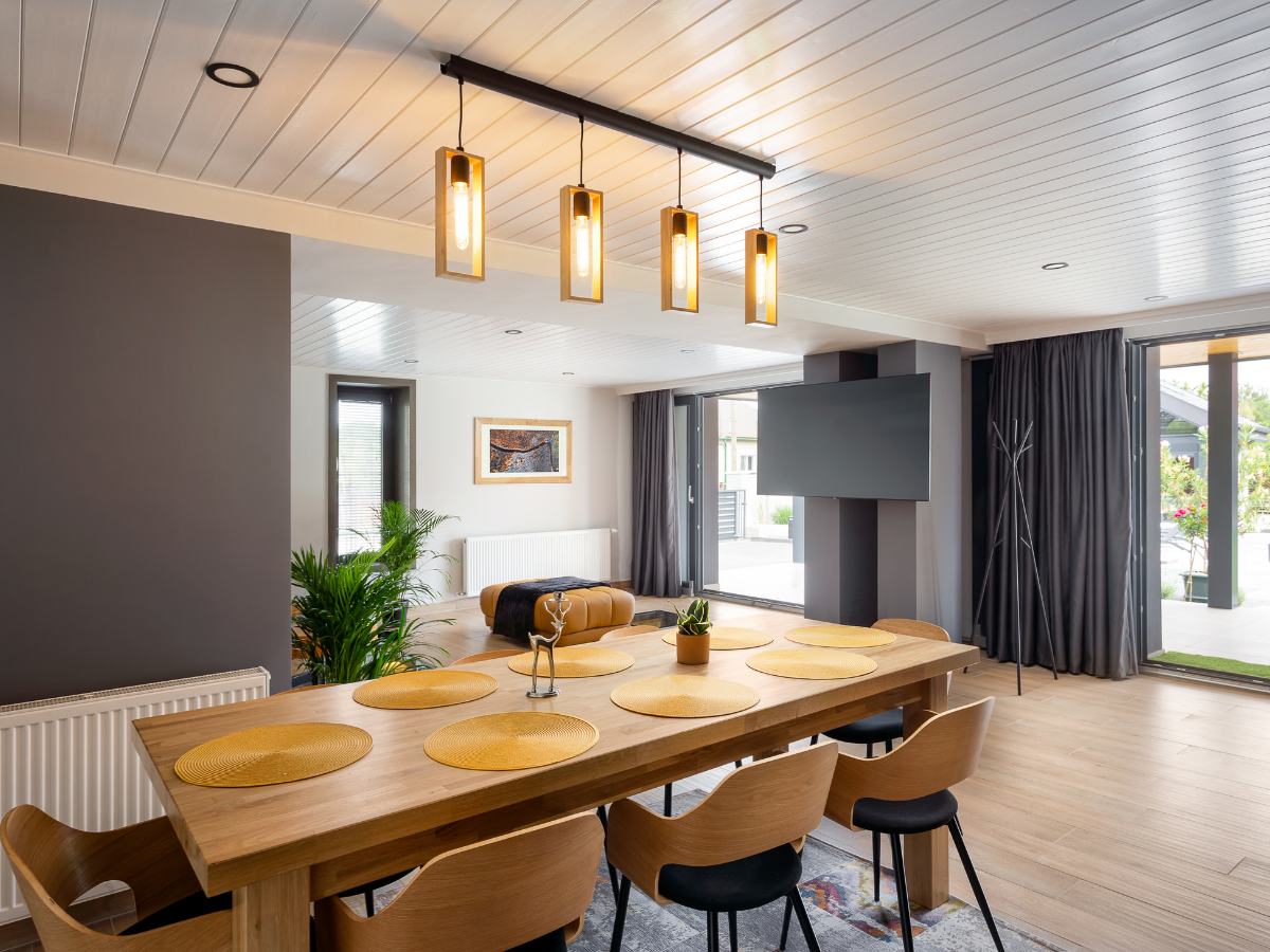 Étkező és nappali: étkezőasztal 8 db székkel, kandalló, bortrezor, sarokkanapé, UHD Smart televízió (IPTV, magyar és idegennyelvű programokkal)