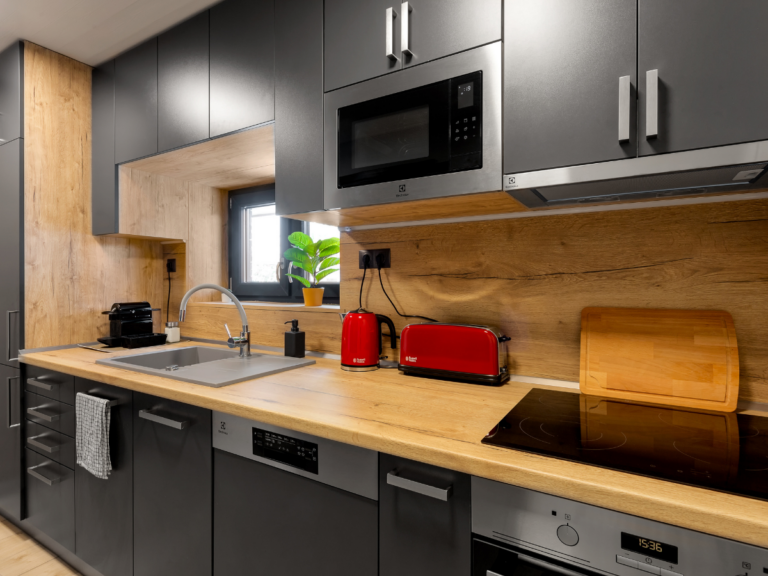 Konyha: étkezéshez és főzéshez szükséges eszközök, továbbá Nespresso kapszulás kávéfőző (személyenként 1 db kávékapszula bekészítés), kenyérpirító, vízforraló, hűtő (alul fagyasztóval), sütő, páraelszívó, mikrohullámú sütő, mosogatógép, mosogatószer, tisztítószer, seprű-lapát, cipőápoló eszköz, varrókészlet