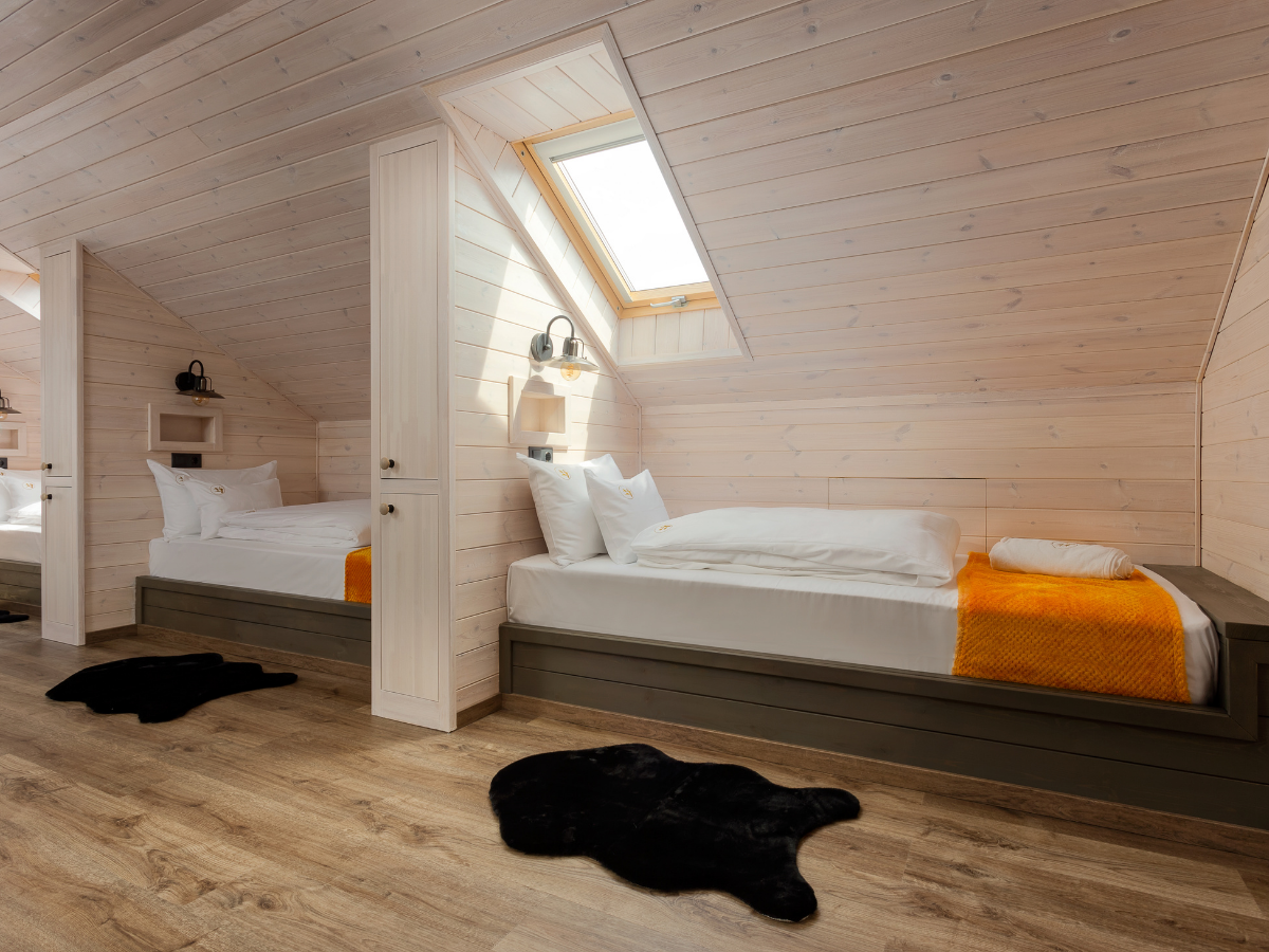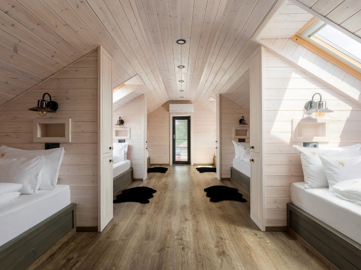 A kétszintes ház emeletén egy franciaágyas, valamint egy 6 ágyas szoba található. A 6 ágyas szoba a klasszikus tábori hangulatot idézi, amelyet prémium minőségű matracokkal és egyedi belső kialakítással tettünk még komfortosabbá. Az emeleten különálló illemhelyiség is rendelkezésre áll.